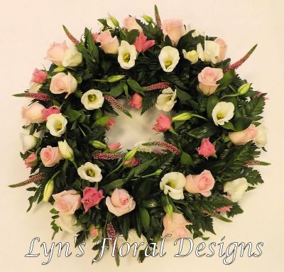 Pink Roses, Lisianthus and Veronica combine to make this a very pretty wreath